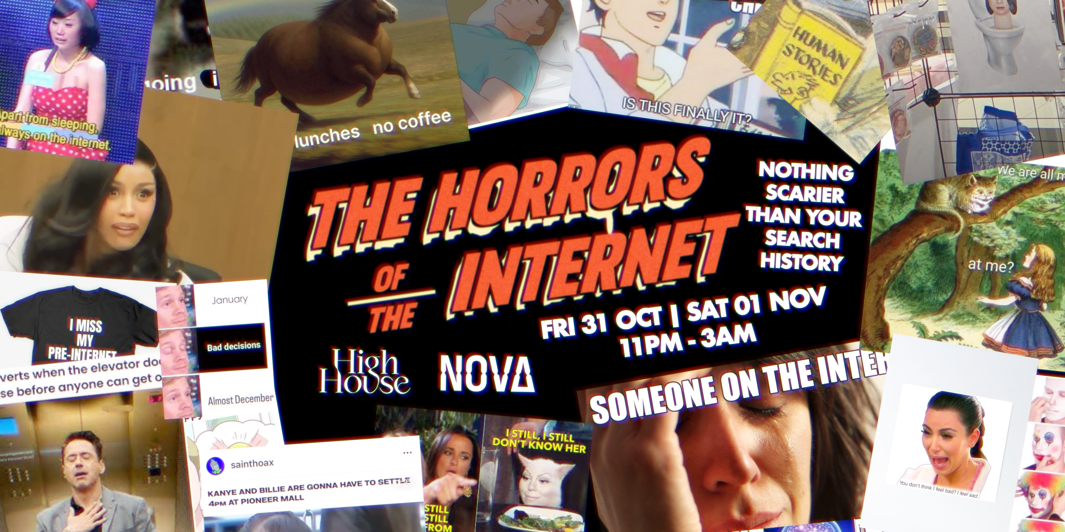 The algorithm’s watching and the system’s crashing. Welcome to the Horrors of the Internet — where your search history is leaked, Hinge red flags multiplied, and memes come alive. Dress as your favourite meme or internet personality for free entry.